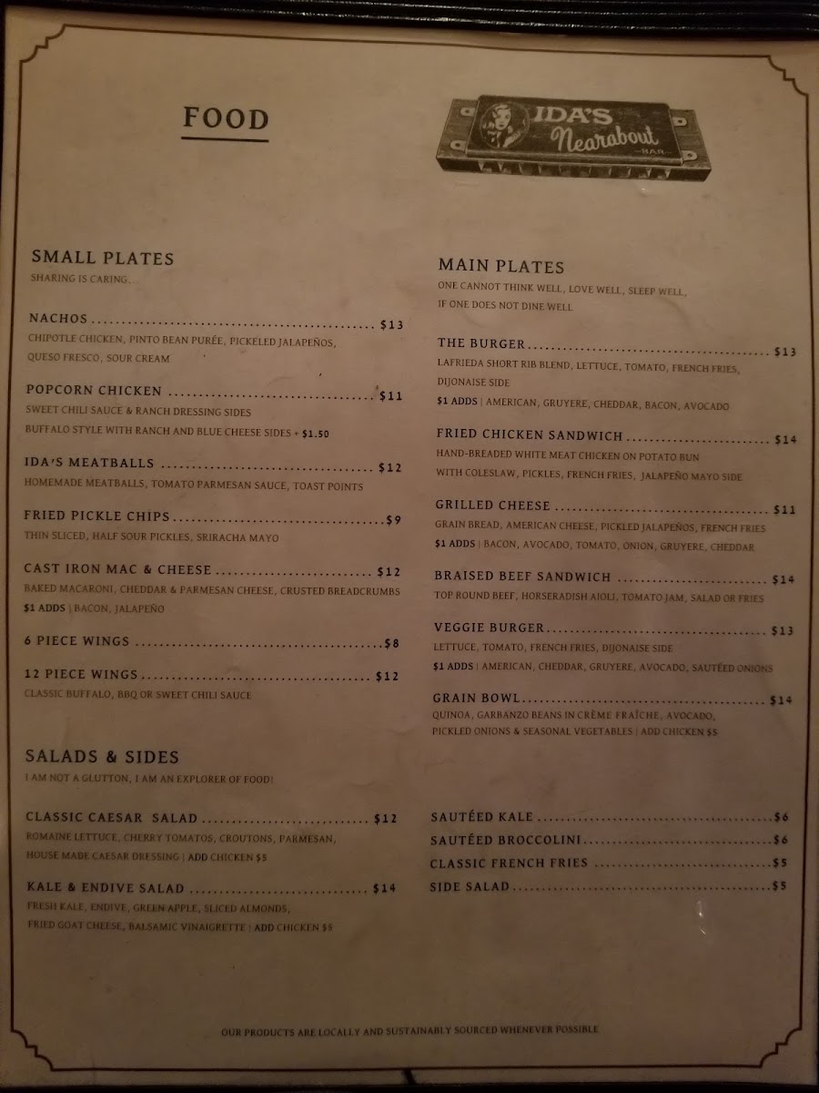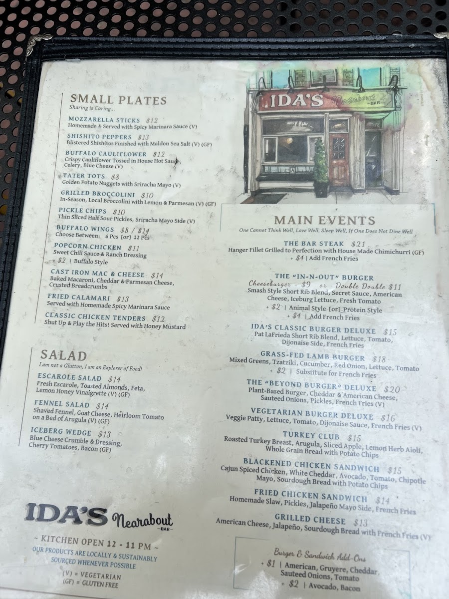 Welcome to Ida's Nearabout, a charming gastropub perfectly nestled in the heart of Sunnyside, NY. If you’re looking for a place that combines vibrant atmosphere, delicious fare, and a welcoming local vibe, then this spot should be at the top of your list. With a menu that showcases a delightful mix of small plates, hearty main courses, and refreshing salads, there's something for everyone to enjoy.